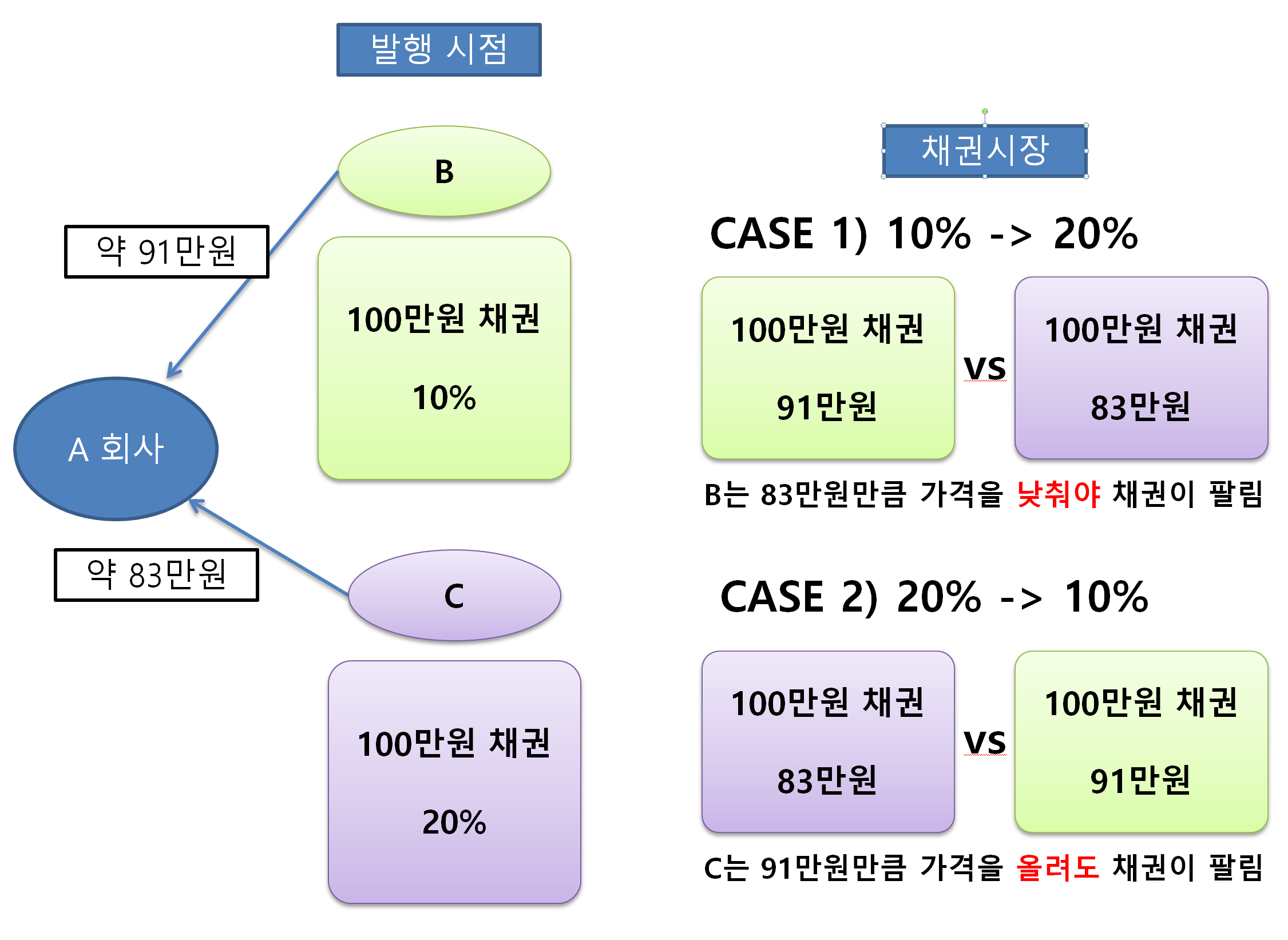 이미 발행된 채권들은 이자가 변경되는 것도 아닌 데, 왜 금리 인하로 채권 매매가가 상승할까요? 저는 이 부분에 대해서 오랫동안 이해를 하지 못했습니다. 이는 비교우위로 설명할 수 있습니다. 예를 들어 앞서 회사채를 발행했던 CEO A가 하루 뒤 또 1,000,000원을 갚기로 하는 회사채를 발행합니다. 그런데 이번에는 금리가 20%입니다. 새로운 채권 매수자 C는 이 채권을 약 833,333원에 매수할 수 있습니다. 똑같이 1년 뒤 100만 원을 돌려받을 수 있는 채권인데 B는 91만 원을 주고 샀고 C는 83만 원을 주고 샀습니다. B와 C가 이 회사의 채권을 판다고 합니다. 이 회사의 채권을 팔고 싶다면 B는 91만 원을 주고 샀지만 C보다 월등히 비싸므로 가격을 C의 수준으로 낮춰주어야 합니다. 즉 금리가 10% -> 20%로 상승하니 채권 가격을 낮춰야 거래가 가능하게 된 것입니다. 물론 B가 만기까지 보유해서 100만 원을 받아도 됩니다. 매매하는 거래시장에서의 채권가격이 이런 방식으로 흐른다는 것입니다.