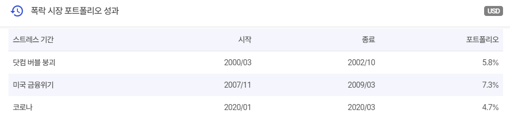 채권으로만 구성한 만큼 MDD가 -9% 낮은 편입니다. 그러나 연환산수익률이 5% 미만이라 은행예금을 생각하게 될 듯합니다. 재밌는 결과를 발견했습니다. 대표적인 폭락시장을 보면 2000년대 닷컴 버블 붕괴와 2008년 리만브라버스시기, 그리고 2020년 코로나시기에 모두 수익을 기록했다는 것입니다.